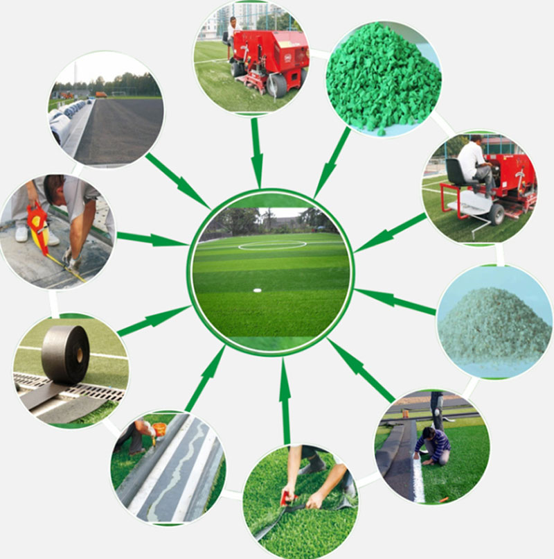 1.灌沙工艺:草亩内,用石英砂进行固定草亩,使草亩不倒伏,灌沙到草亩剩余高度2-3厘米以内,在草亩表面铺撒橡胶颗粒。铺撒要均匀。